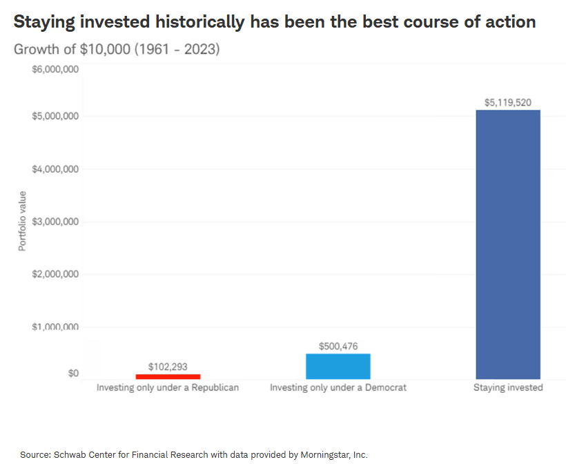 At the end of the day, long-term equity returns are largely agnostic to political party and the outcomes of elections (see graph below). Indeed, the ability to accurately forecast short term moves in markets is about as rare as the ability to accurately forecast election results. We remain convinced that a diversified portfolio that is rooted in quality and personalized to an investor’s own willingness, need, and ability to take risk, will continue to benefit investors in both the months and years ahead.